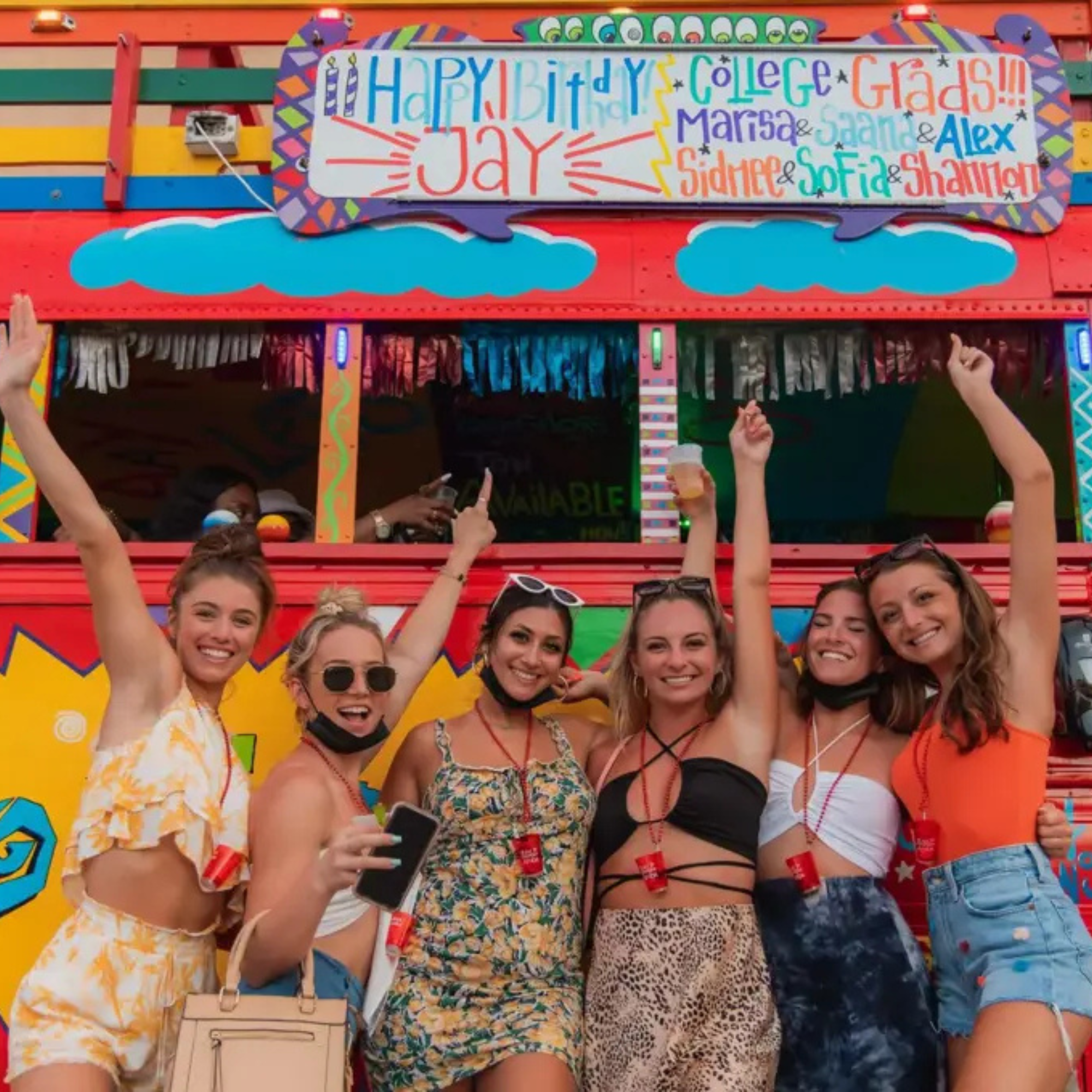 Start your happy hour adventure with a toast on the bus—your first shot is served with a smile and a shake of the maracas.